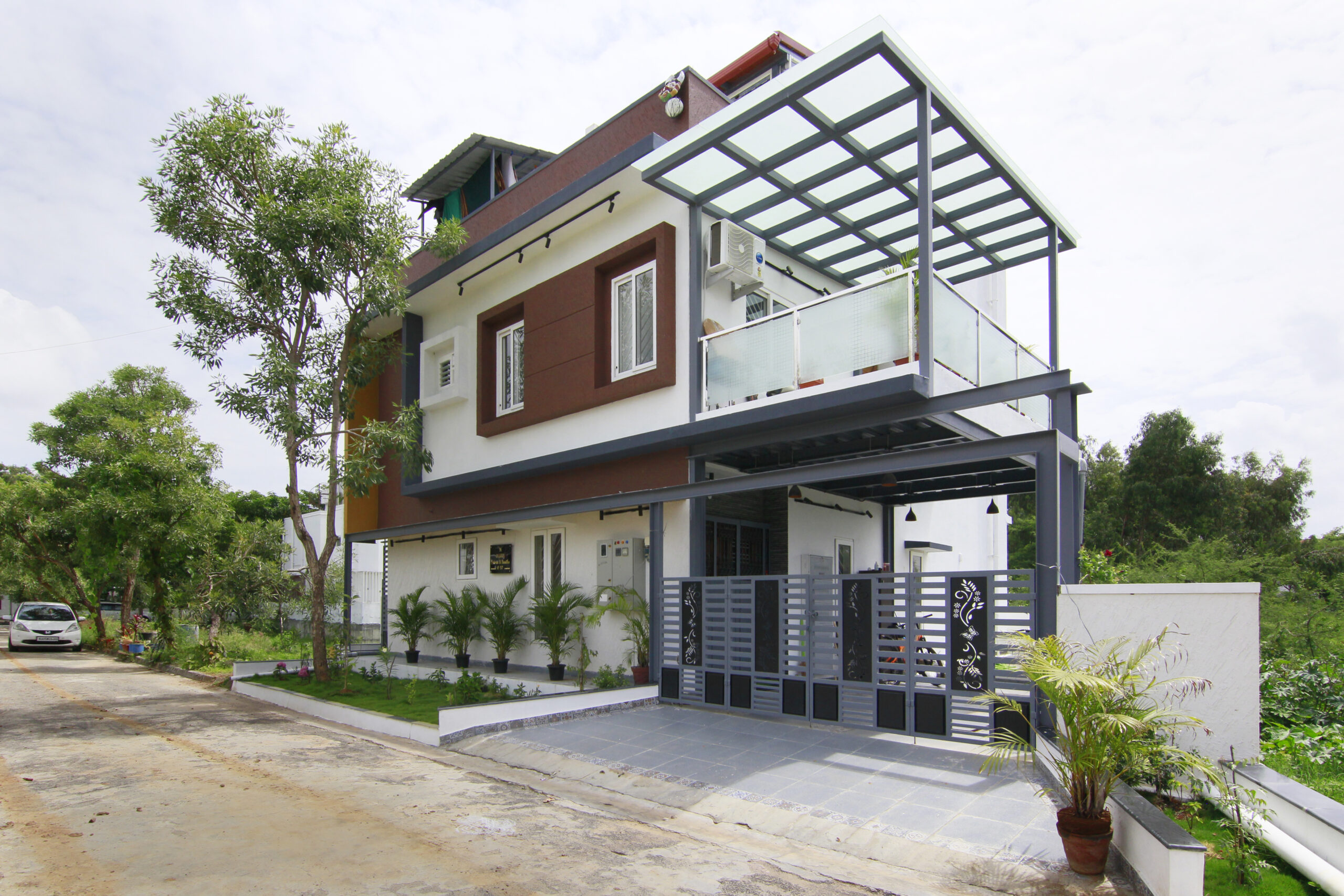 Mr. Sriram’s Residence is a thoughtfully designed G+1.5 floor residence built over a site area of 1600 sq.ft with a built-up area of 2300 sq.ft. The home is conceived to cater to the needs of a busy working family, combining comfort, safety, and aesthetic appeal within a Spacious plot.